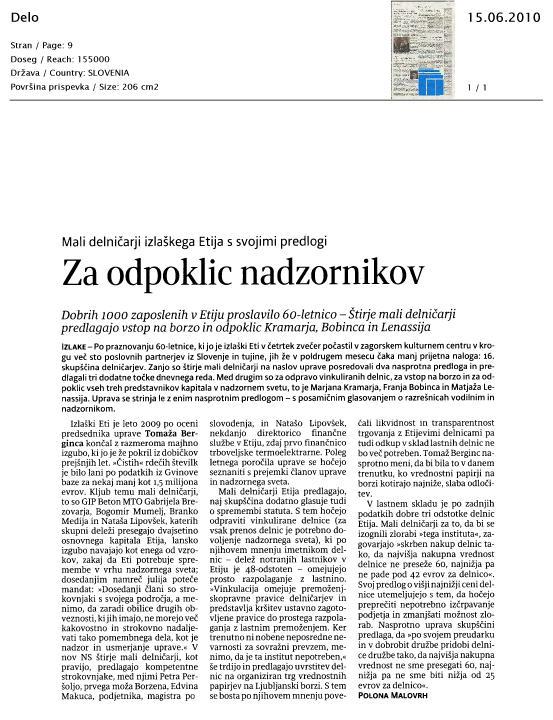 »Glede na ustvarjeno izgubo v letu 2009 in nič kaj prepričljivejše poslovne napovedi in izboljšanje poslovnih rezultatov za leto 2010 je potrebno pristopiti k aktivnej ši vlogi lastnikov,« odpoklic utemeljujejo štirje mali delničarji Etija; to so GIP beton MTO, Bogomir Mumelj, Branko Medija in Nataša Lipovšek. Bobinac, Lenassi in Kramar, kije tudi predsednik NS, zaradi »obilice drugih obveznosti« ne morejo več strokovno in kakovostno opravljati nadzora, trdijo v nasprotnem predlogu za skupščino, ki bo 7. julija. Za nove tri nadzornike predlagajo direktorja Borzena Karala Petra Peršoljo, podjetnika Edvina Makuca in direktorico finančne službe v trboveljski termoelektrarni Natašo Lipovšek.