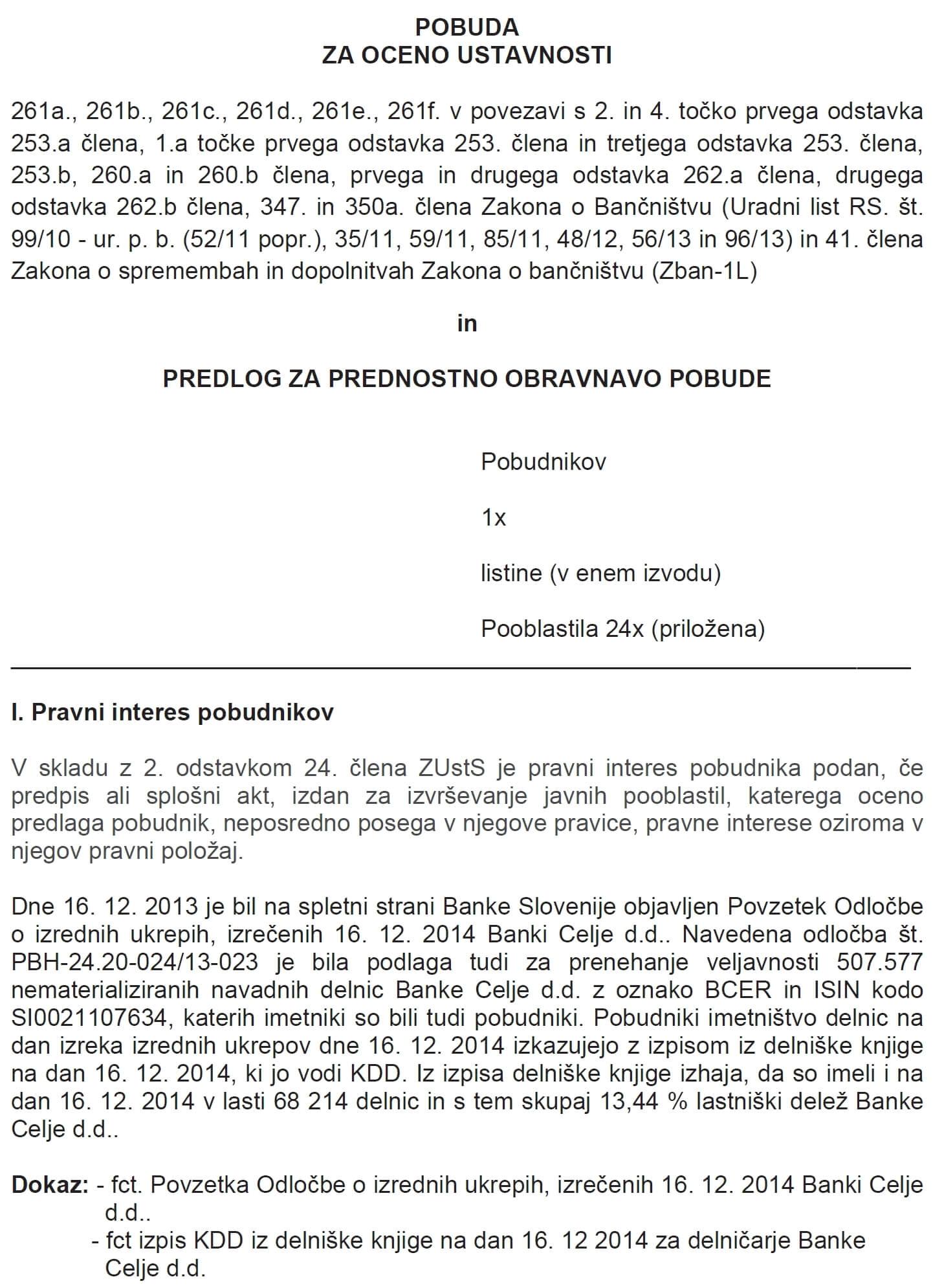 Poziv ustavnemu sodišču Republike Slovenije naj nemudoma odloča o spornih členih Zakona o bančništvu (ZBan-1L)